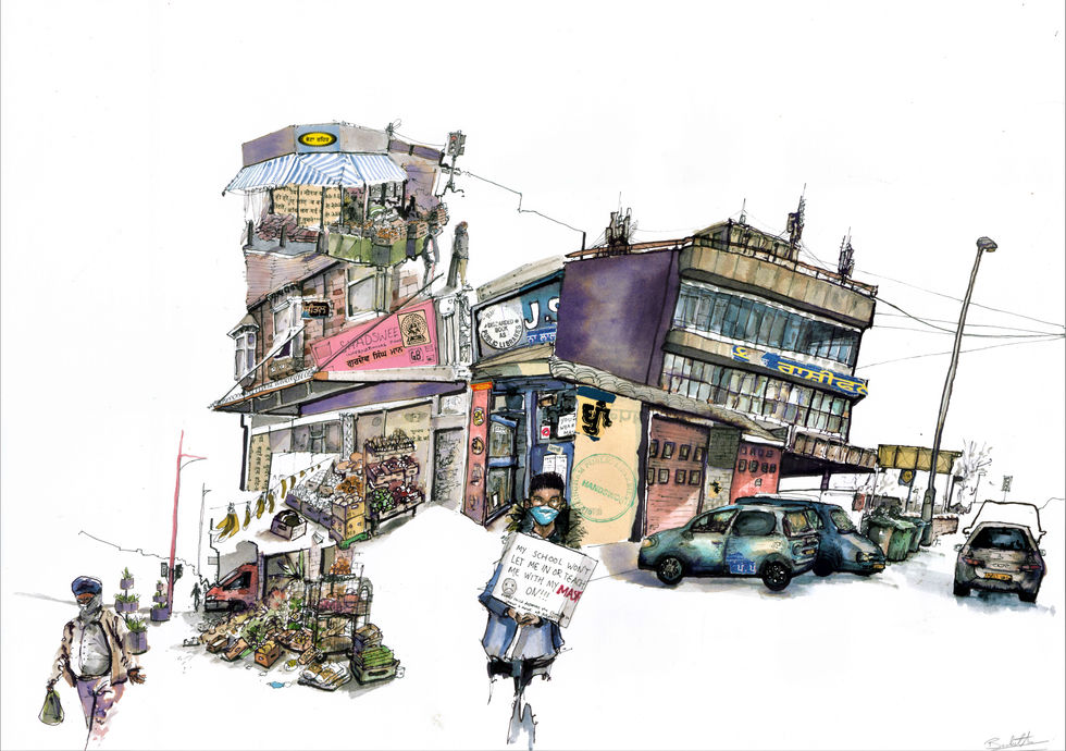 The illustrations in this series seek to piece together the sights from a walk in Handsworth and evoke a sense of what daily life feels like during the Covid-19 pandemic.